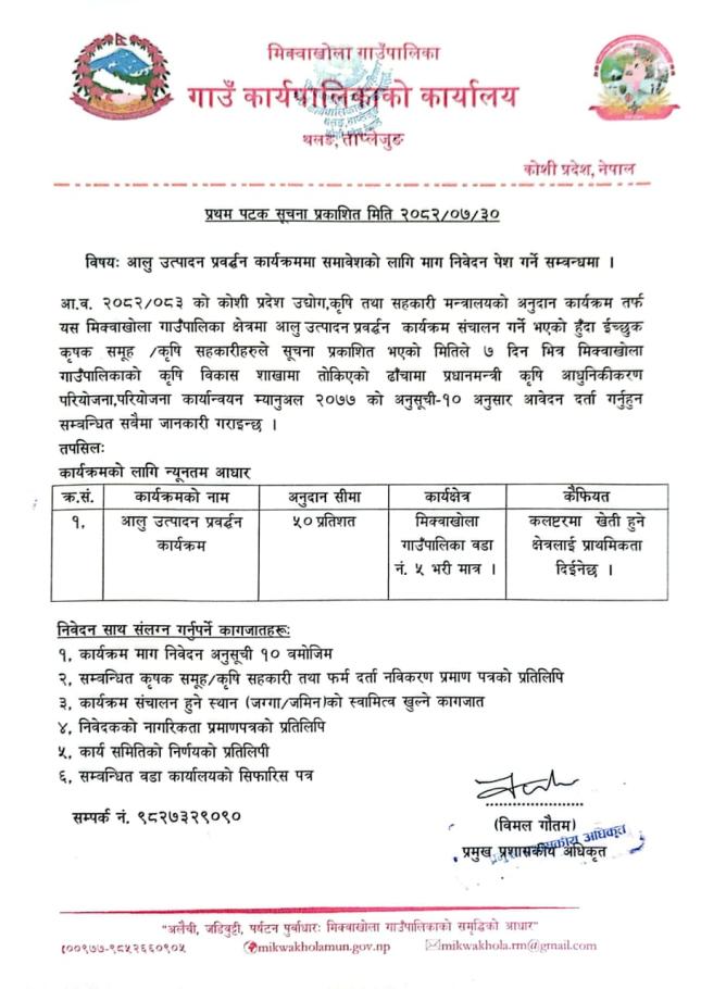 » आलु उत्पादन प्रवर्द्धन कार्यक्रममा समावेशको लागि माग निवेदन पेश गर्ने सम्बन्धमा प्रथम पटक प्रकाशित सूचना ।