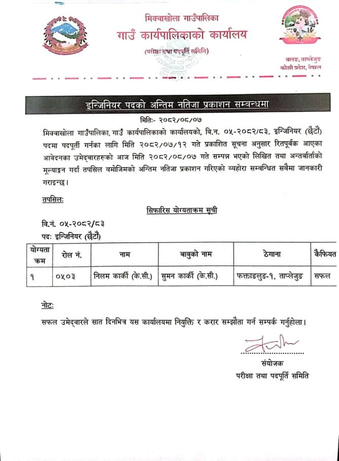 इन्जिनियर पदको अन्तिम नतिजा प्रकाशन सम्बन्धमा ।