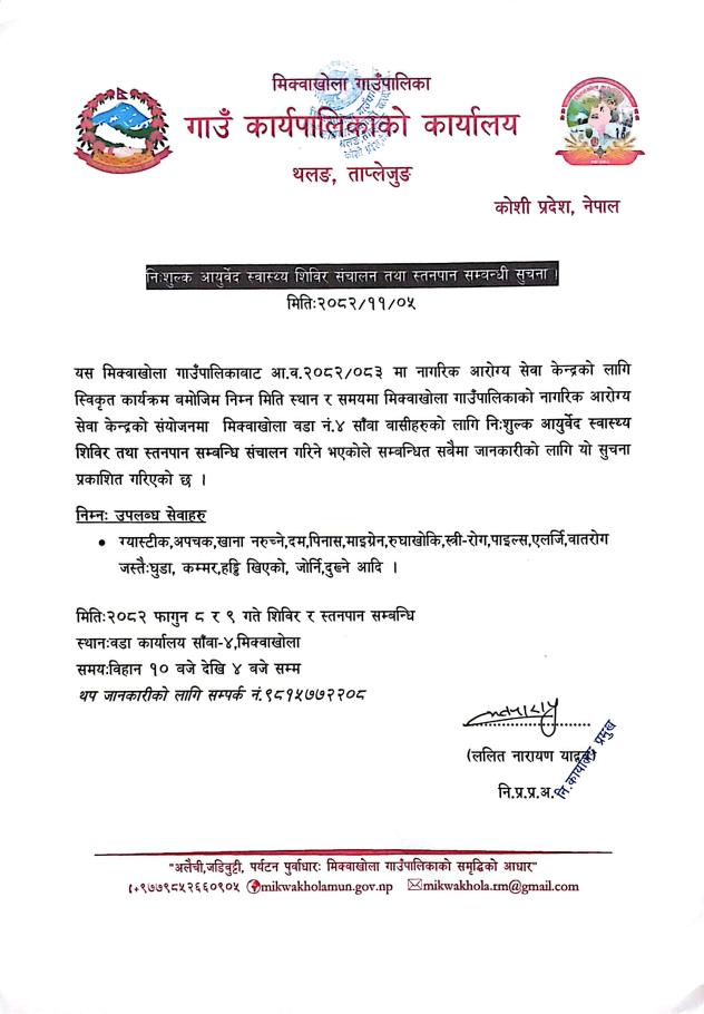 निःशुल्क आयुर्वेद स्वास्थ्य शिविर सञ्चालन तथा स्तनपान सम्बन्धी सूचना !!!