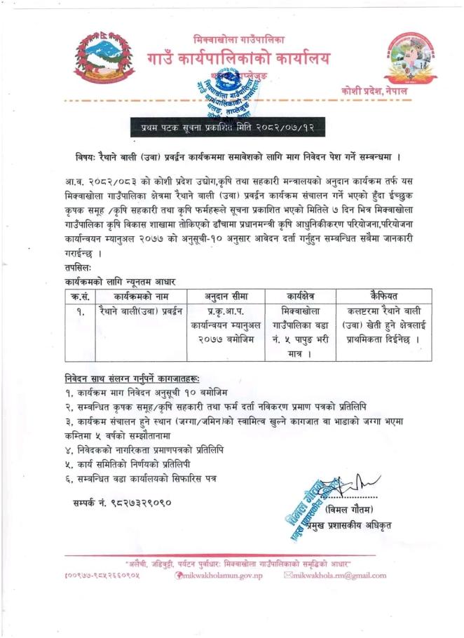 » रेेथाने बाली (उवा) प्रवर्द्धन कार्यक्रममा समावेशको लागि माग निवेदन पेश गर्ने सम्बन्धमा सूचना !!!