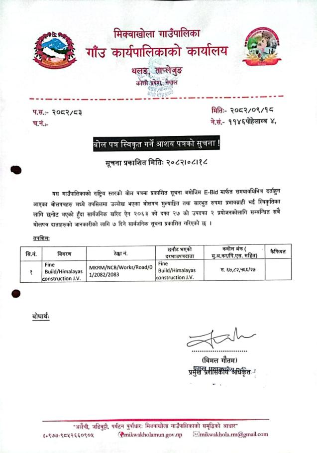 बोल पत्र स्विकृत गर्ने आशय पत्रको सूचना !!!