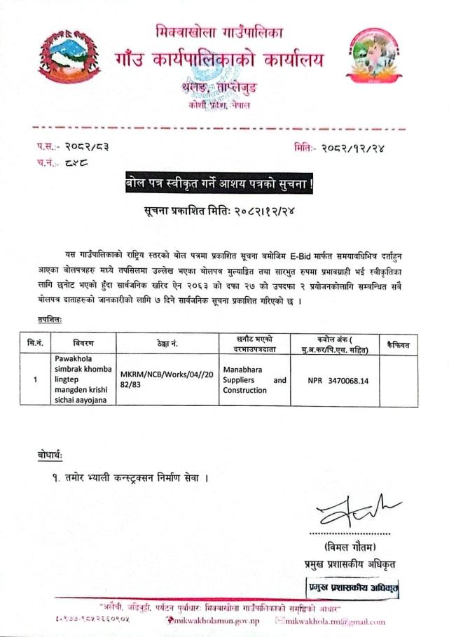 बोल पत्र स्वीकृत गर्ने आशय पत्रको सूचना !!!
