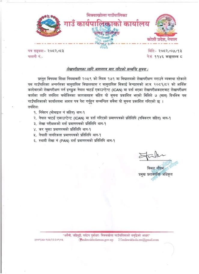 लेखापरीक्षणका लागि आशयपत्र माग गरिएको सम्बन्धि सूचना !!!